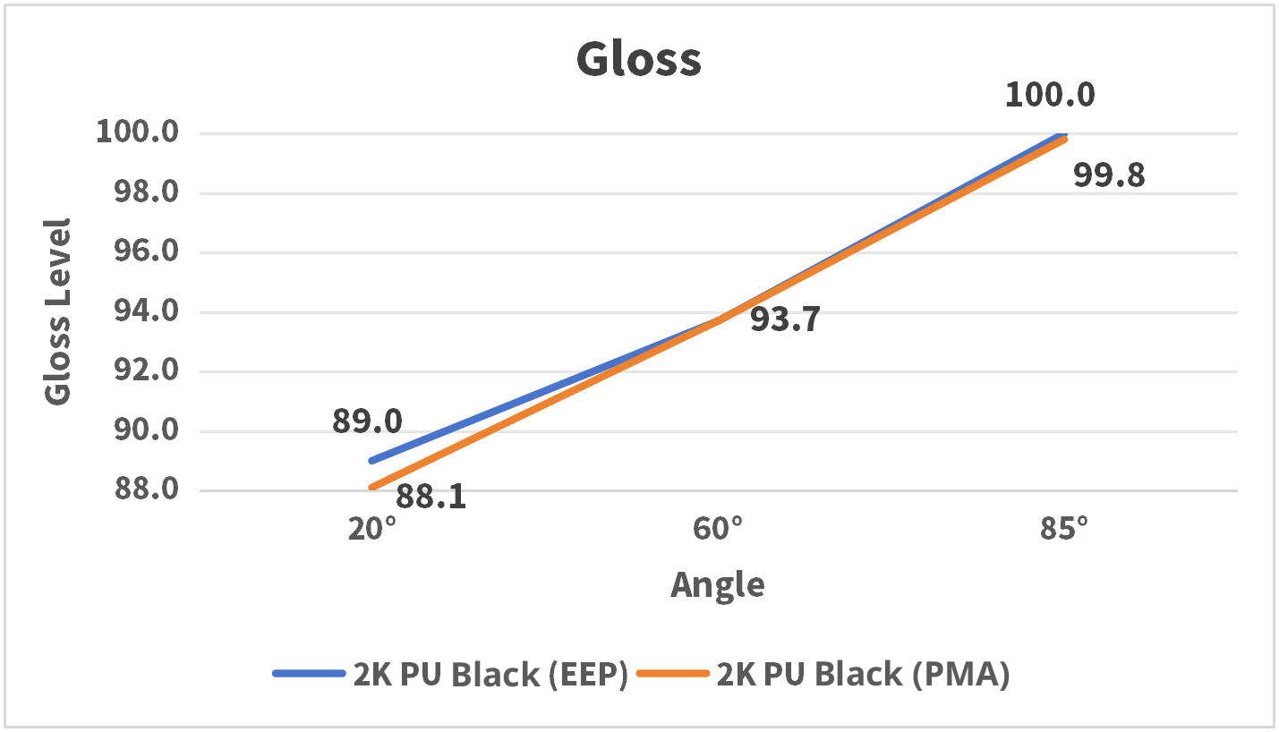 - 2K PU Black (EEP) and 2K PU Black (PMA) are identical in terms of drying time, appearance, hardness, and adhesion.